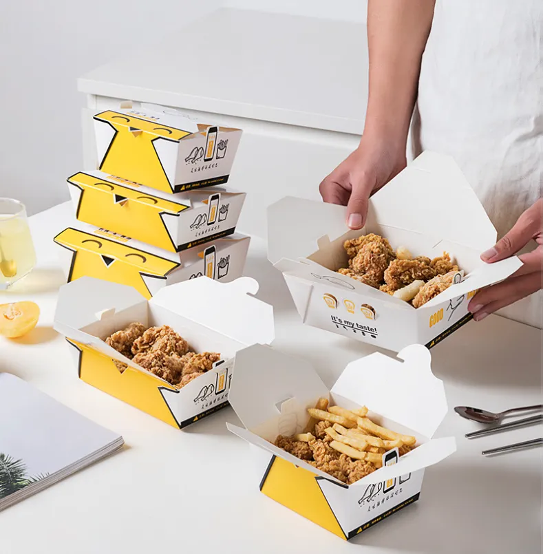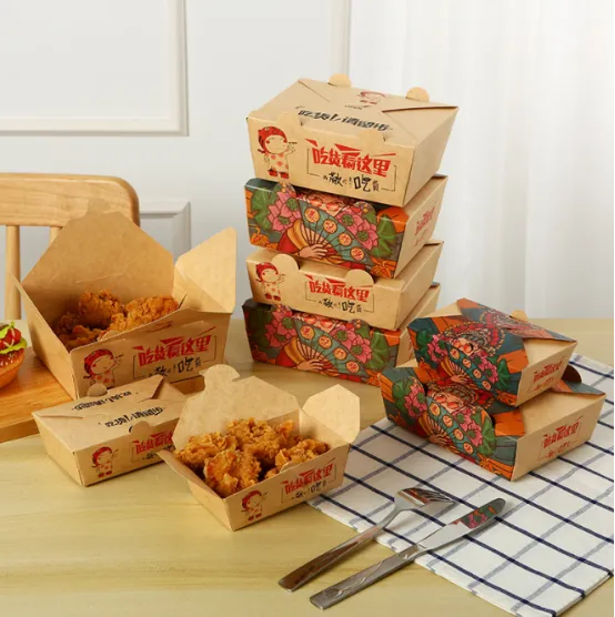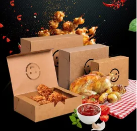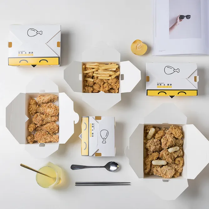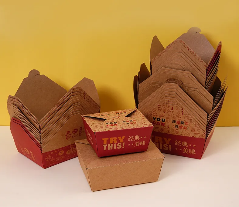 La scatola per pollo fritto è un tipo di contenitore per imballaggio in carta per pollo fritto appositamente progettato per l'industria dei fast food. La scatola per pollo fritto è realizzata in cartone alimentare resistente alle alte temperature e agli oli, impermeabile e a prova di perdite, adatto al caldo e al freddo e facile da confezionare. È una pratica scatola per pollo fritto con buona tenuta e isolamento, che può mantenere efficacemente la freschezza e la temperatura del pollo fritto. La scatola di pollo fritto prodotta dalla fabbrica Zemeijia supporta la stampa personalizzata ed è adatta per scene da asporto, catering e feste.