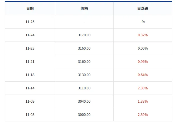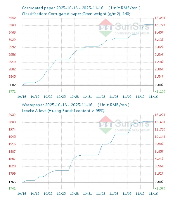 Per la carta ondulata da 140 g/m², i prezzi sono aumentati del 12,09% tra il 16 ottobre e il 16 novembre 2025. Su un periodo più lungo (dal 27 agosto al 25 novembre), i guadagni cumulativi hanno raggiunto il 20,99%. Entro il 24 novembre, l'ultimo prezzo ha raggiunto 3.170 RMB per tonnellata, con piccoli aggiustamenti al rialzo che continuano.